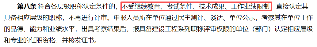 符合各层级职称认定条件的,不受继续教育、考试条件、技术成果、工作业绩限制,直接认定其具备相应层级的职称,不再进行评审。